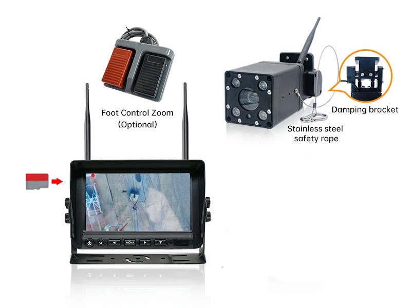 Ce produit associé à un moniteur HD sans-fil, dispose d’un écran numérique haute résolution de 7 pouces, d'un récepteur sans fil 2,4 GHz intégré, prend en charge l'appairage à code à sauts de fréquence multiples et une portée de transmission en champ libre de 100 mètres. Il est équipé d’un processeur DSP industriel de qualité automobile, d’un menu OSD graphique, d’un support métallique anti-rouille, ainsi que d’une large plage de tension de fonctionnement et d’un circuit de protection multiple.